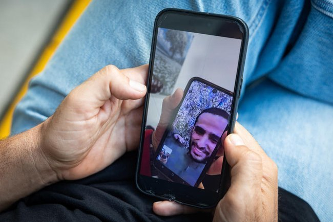 Мужчина смотрит фото освобожденных заложников на Площади заложников в Тель-Авиве. Фото: Хаим Голдберг/Flash90